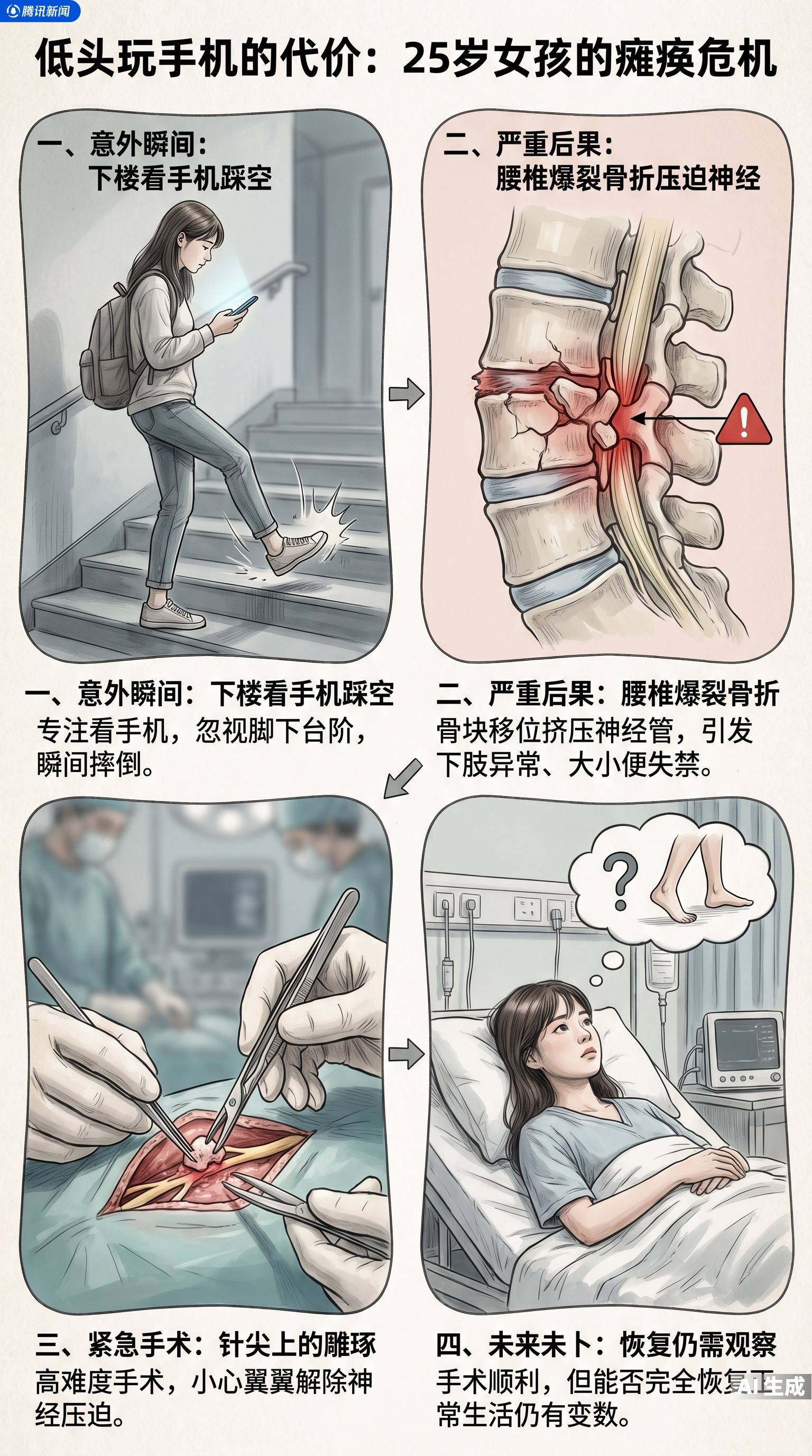 25岁的小秋怎么也没想到,一次习以为常的下楼看手机配资114查询网,竟让她的后半生面临瘫痪的威胁。有消息传出,这名25岁的女孩在上下楼梯时,因低头专注玩手机未注意脚下,不慎踩空摔倒,最终造成腰椎爆裂性骨折,面临瘫痪风险。一场看似平常的低头瞬间,酿成了足以影响终身的意外。